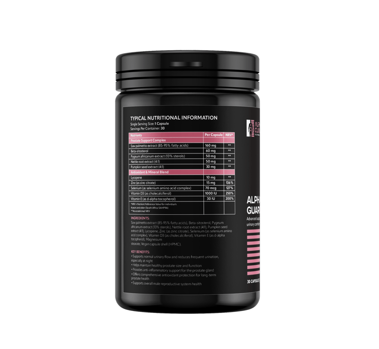 Alpha Guard is an advanced formula dedicated to supporting normal urinary flow, reducing frequent urination, and helping maintain a healthy prostate size and function. It provides key ingredients like Saw Palmetto, Beta-Sitosterol, and Lycopene for comprehensive prostate support.