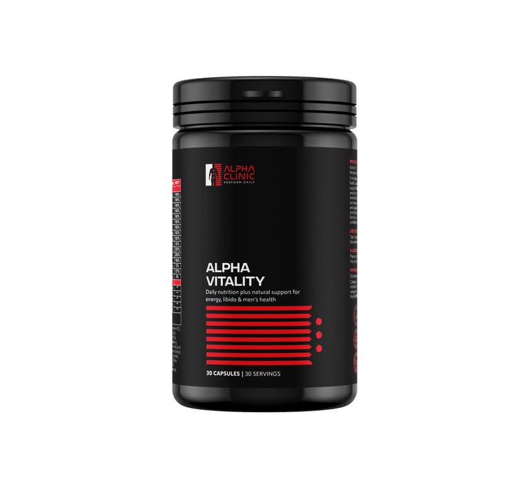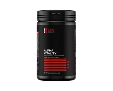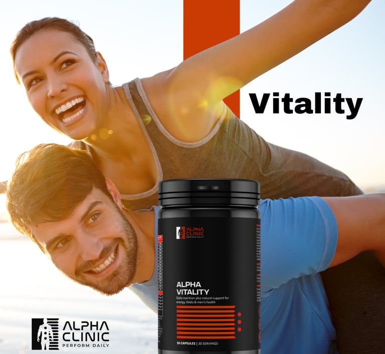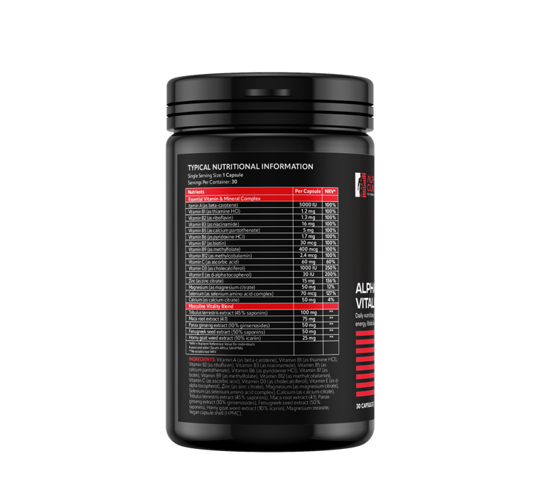 Alpha Vitality is a comprehensive daily supplement engineered to provide essential nutritional support specifically tailored for masculine health. It combines a high-potency Essential Vitamin & Mineral Complex with a targeted Masculine Vitality Blend to support daily energy, immune function, and overall physical performance.